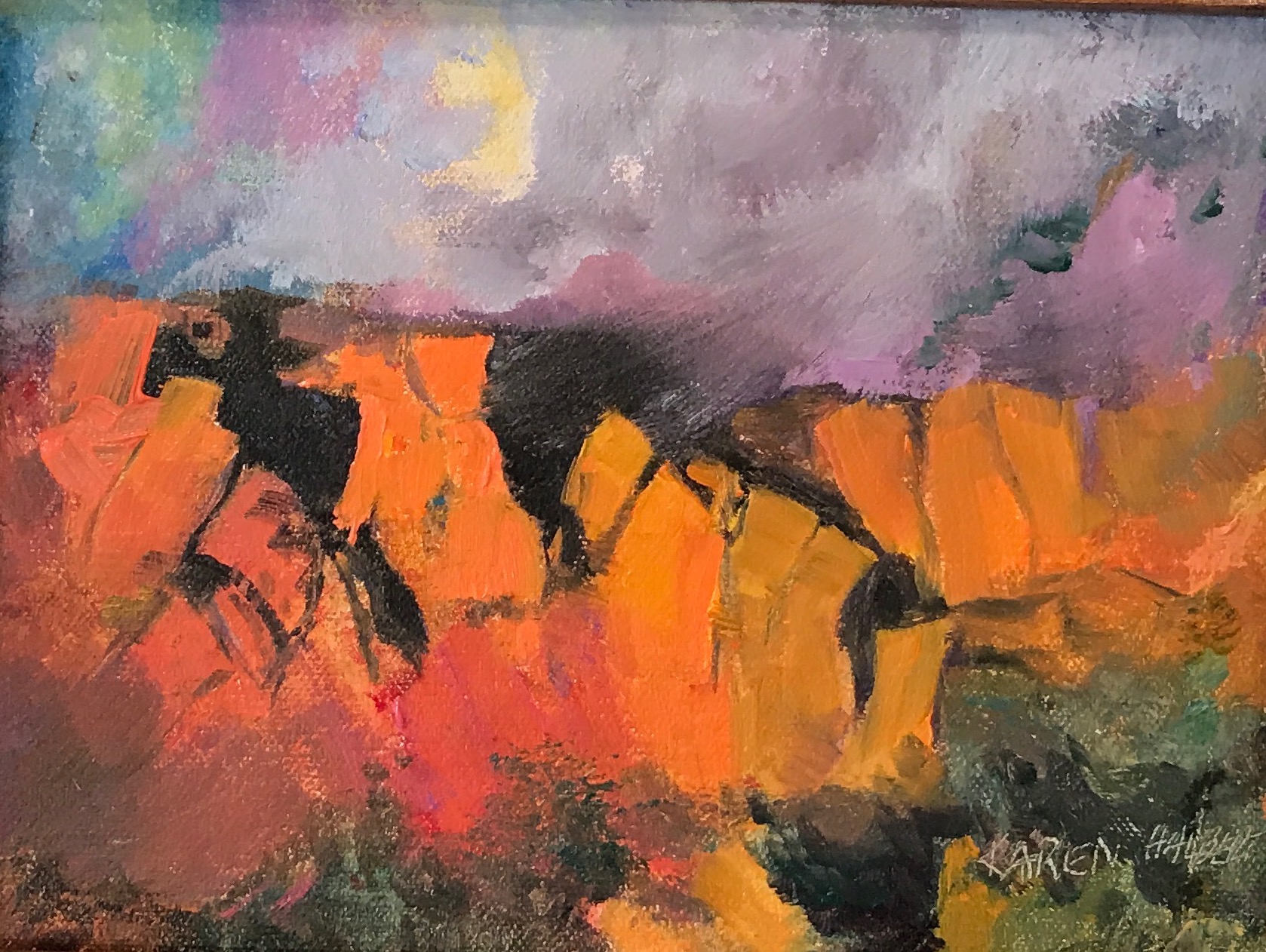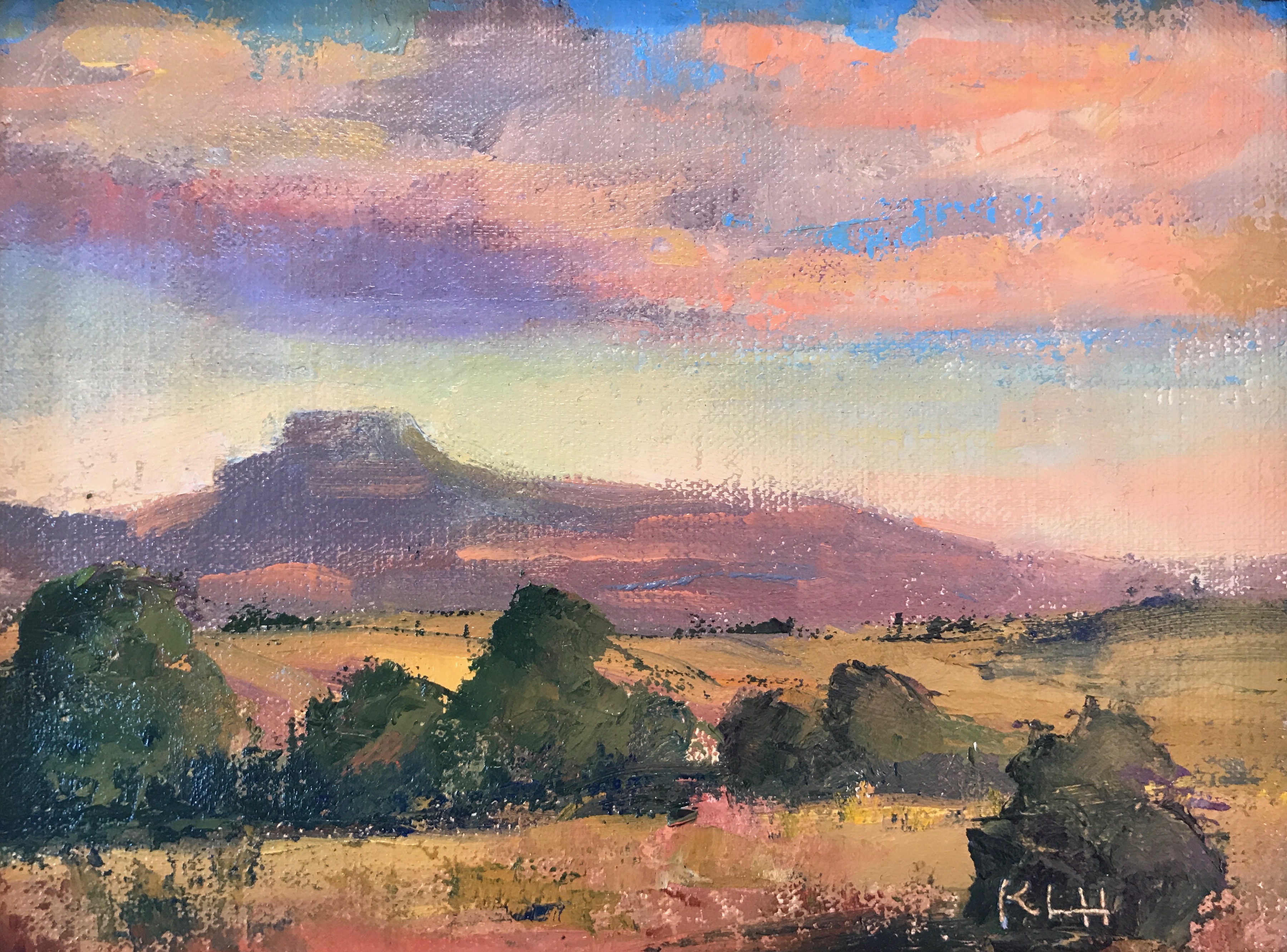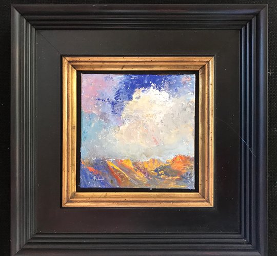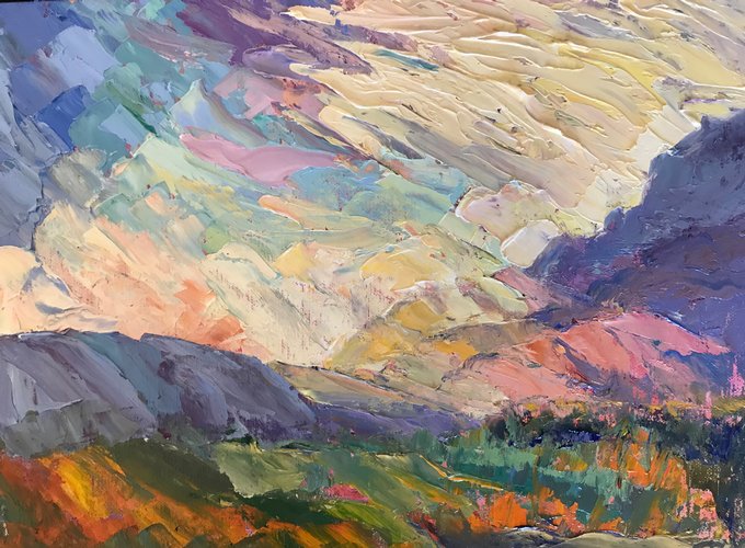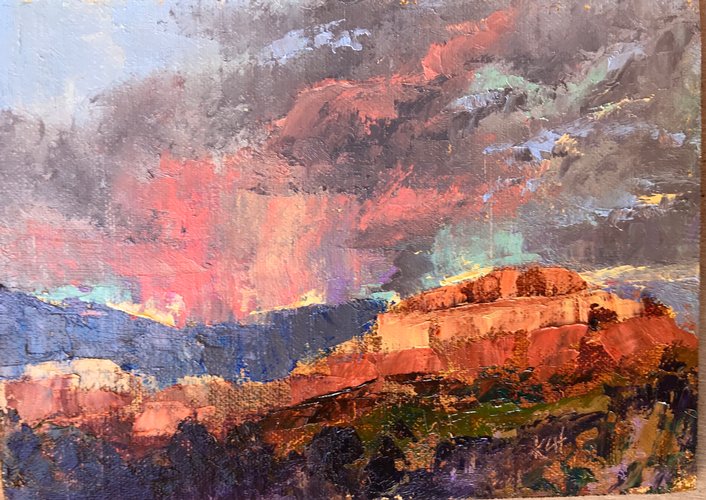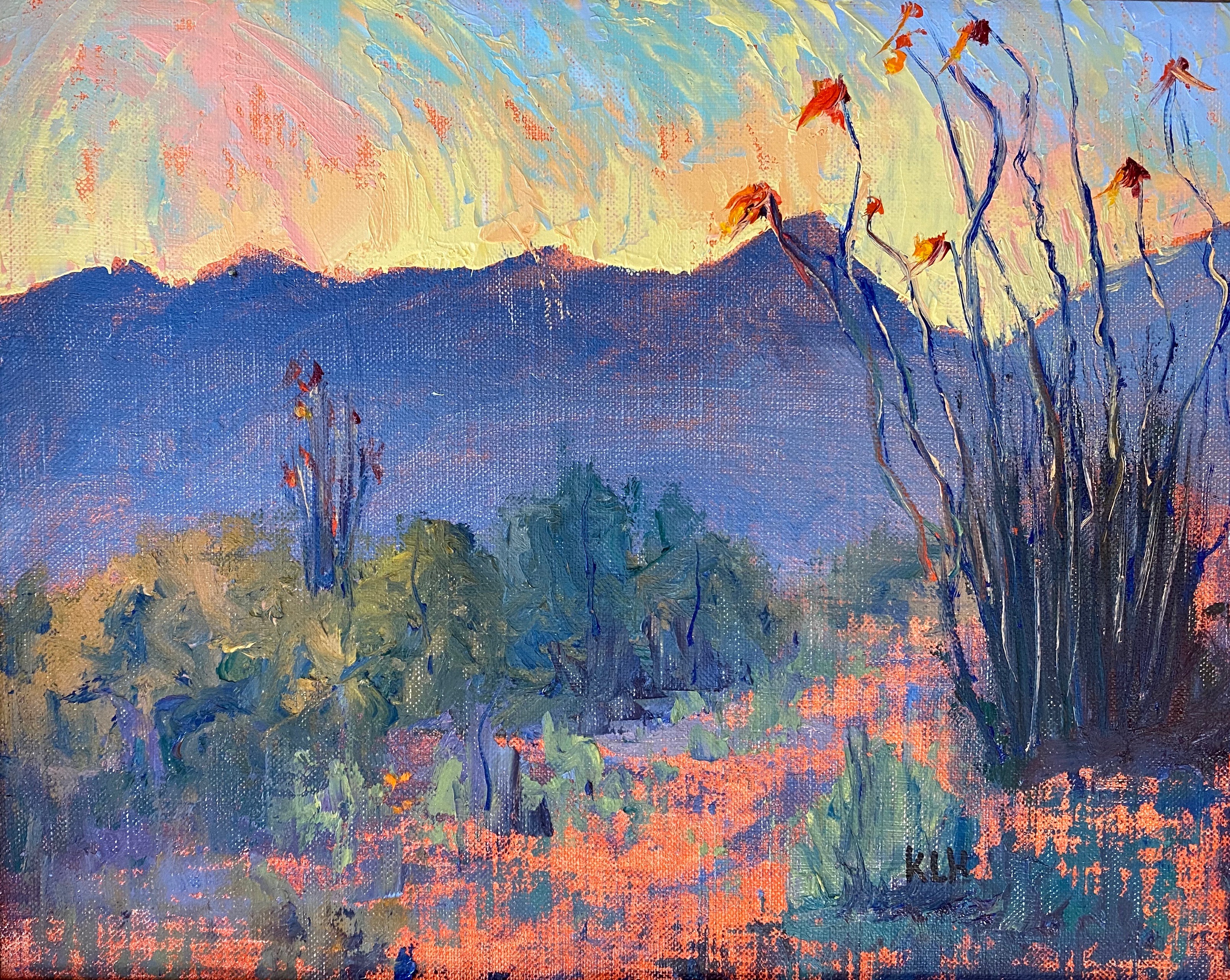 Sold Jun 20, 2020 by the Marigold Gallery in Santa Fe. Daily morning walk view. One of a series exploring the colors of the desert: Ocotillo, desert and mountains. Compare with other Ocotillo versions. Expanded palette (Cobra): Cadmium Yellow Light, Vermillion, Madder Lake, Ultramarine Blue, Phthalo Blue, and White plus: Cobalt BLue, Phthalo Green, Sap Green, Viridian, cadmium lemon, Cadmium Red Light and Medium, Opera (Holbein Duo), Blue Violet (dioxide purple), yellow ochre, burnt sienna. #paletteknife, #paptertowel, #radicalimpressionism, #santaritamountains.